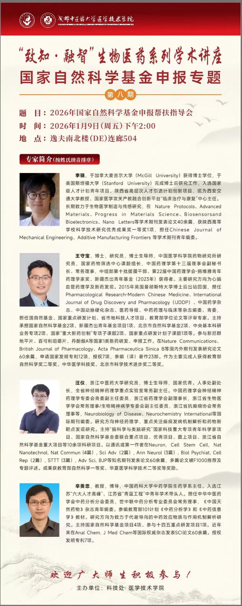 会议预告丨“致知·融智”生物医药系列学术讲座 国家自然科学基金申报专题第八期 发布时间:2026-01-05 17:12:41 浏览次数: 次 【字体:小 大】 题 目:2026年国家自然科学基金申报帮扶指导会时 间:2026年1月9日 (星期五) 下午14:00地 点:温江校区逸夫南北楼(DE)连廊504主讲人:李 骁 西安交通大学 王守宝 中国医学科学院药物研究所 汪 仪 浙江中医药大学 辛贵忠 中国药科大学主 办:科技处 医学技术学院 【打印正文】 上一条:学术成果丨伟德学者在《Drug Resistance Updates》发表光热微凝胶递药体系促进耐药菌感染伤口愈合的研究成果 下一条:会议预告丨“岐黄”传承创新2026年科研能力提升计划学术交流讲座第76期