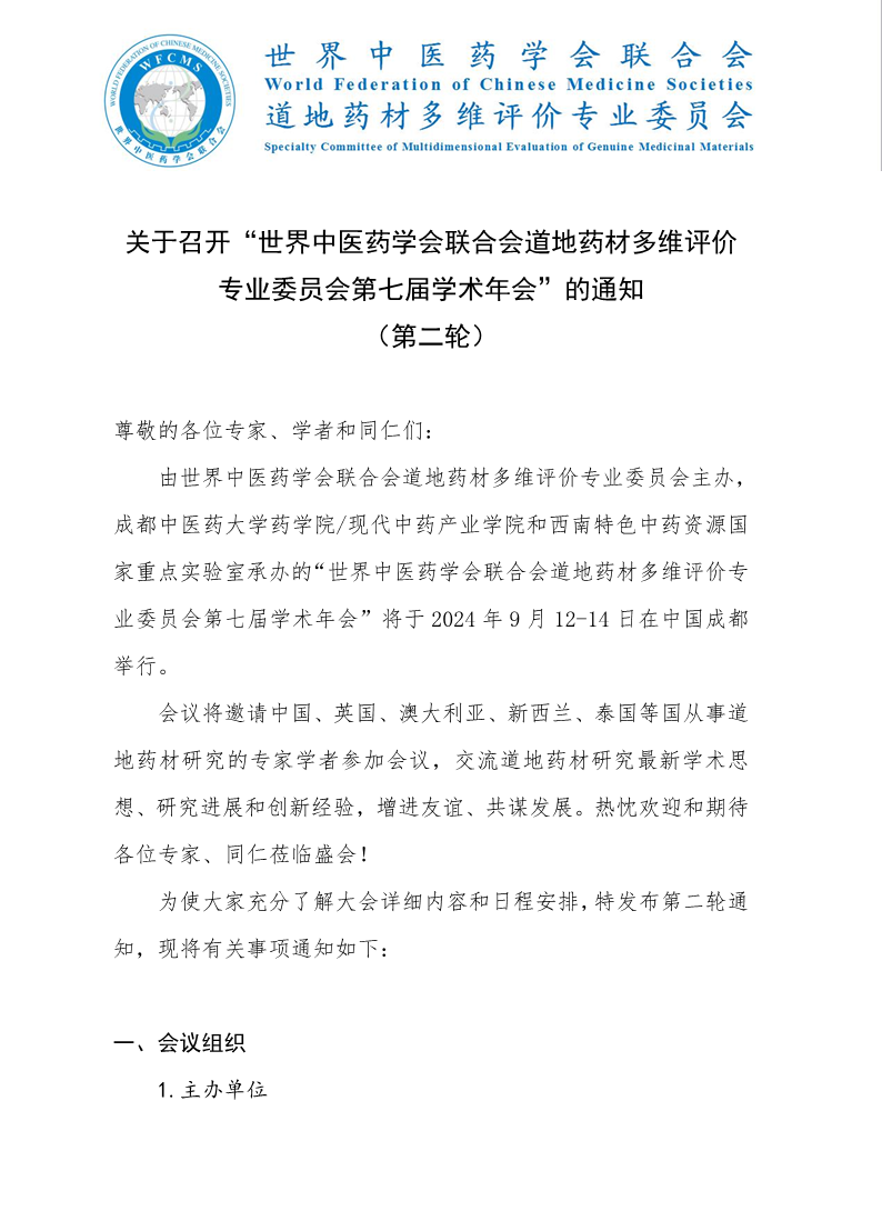 由世界中医药学会联合会道地药材多维评价专业委员会主办,伟德源自英国1946药学院/现代中药产业学院和西南特色中药资源国家重点实验室承办的“世界中医药学会联合会道地药材多维评价专业委员会第七届学术年会”将于2024年9月12日-14日在四川省成都市温江区召开。大会将邀请国/境内外知名专家做专题报告,同时设有青年学者论坛和壁报征集。敬请同行专家、学者、研究生参会和投稿,共话道地药材现代化蓝图!