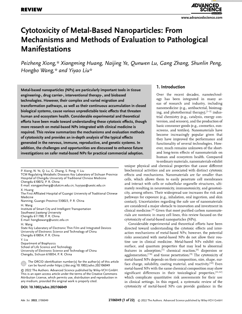 金属基纳米颗粒由于其优异的物理和化学性质,在生物和医学领域中的应用越来越广泛。然而,它们的广泛应用也增加了生物个体的暴露风险和潜在的生物学毒性。近期,伟德源自英国1946附属医院·代谢性疾病中医药调控四川省重点实验室刘贻尧教授团队在国际知名期刊《Advanced Science》(中科院JCR一区Top期刊)上发表了题为《Cytotoxicity of metal-based nanoparticles: from mechanisms and methods of evaluation to pathological manifestations》的论文,系统地从机制、评价方法和病理表现方面总结了金属基纳米材料毒理学的最新研究进展。