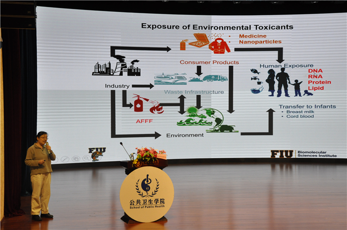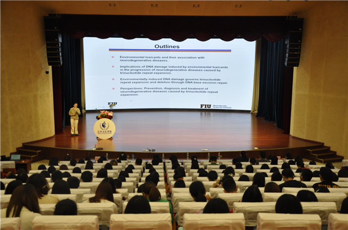 5月6日上午,公共卫生学院2019年度学术活动暨公卫国际论坛系列活动(二)在百汇堂举行,弗罗里达大学Liu Yuan副教授受邀莅临伟德温江校区作《Environmental Toxicants and Human Neurodegenerative Diseases》专题讲座,四川大学华西公共卫生学院张遵真教授作为报告解读嘉宾全程参与了此次活动。发展规划处副处长吴曦,公共卫生学院院长陈大义、副院长饶朝龙,部分教师及同学参加了讲座。讲座由饶朝龙主持。