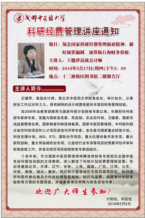 科研经费管理讲座通知 发布时间:2018-05-08 16:16:00 浏览次数: 次 【字体:小 大】 【打印正文】 上一条:第二期全国教学比赛获奖教师教学经验交流会举行 下一条:“点识成金——专利申请实用策略与专利项目运营”讲座通知