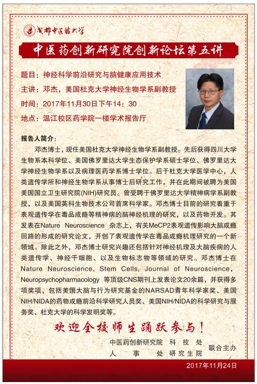 中医药创新研究院创新论坛第五讲通知 发布时间:2017-11-27 16:12:00 浏览次数: 次 【字体:小 大】 【打印正文】 上一条:名家名师名医学术讲座通知 下一条:北京中医药大学毛嘉陵教授来校作学术报告