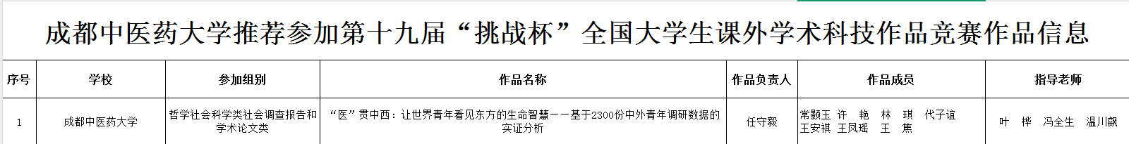 关于推荐伟德作品参加第十九届“挑战杯”全国大学生课外学术科技作品竞赛的公示 发布时间:2025-07-17 18:14:05 浏览次数: 次 【字体:小 大】 第十八届“挑战杯”四川省大学生课外学术科技作品竞赛终审决赛选拔出伟德1项优秀作品,现推荐该作品参加第十九届“挑战杯”全国大学生课外学术科技作品竞赛,详细信息如下:公示时间:2025年7月17日-21日如有异议者,请实名向校团委反映。地点:百会堂207办公室联系人:林婧电话:028-82623909共青团伟德源自英国1946委员会2025年7月17日 【打印正文】 上一条:火热开启 | 第四届全国说医解药科普大赛(四川分赛区) 等您来战! 下一条:关于公布伟德源自英国19462025年公开选调面试资格审查入围人员名单的通知