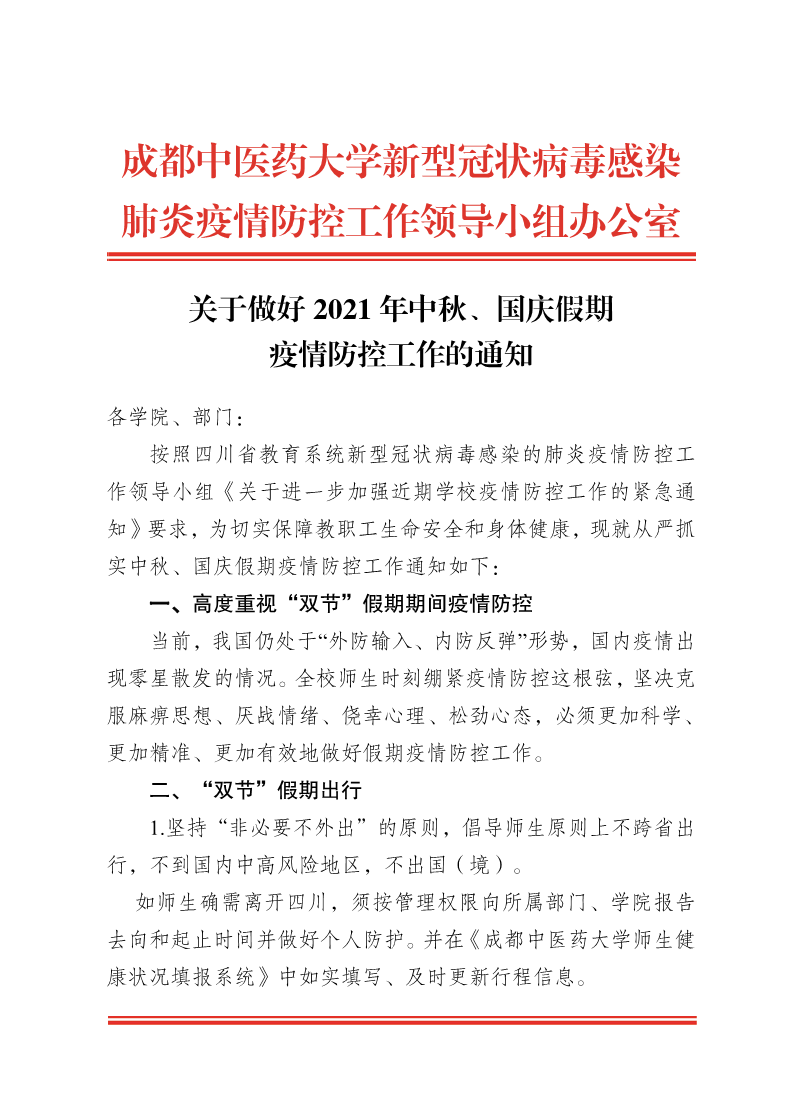 关于做好中秋和国庆假期疫情防控工作的通知 发布时间:2021-09-15 09:31:23 浏览次数: 次 【字体:小 大】 【打印正文】 上一条:关于2021年中秋、国庆放假安排及调整作息时间的通知 下一条:关于进行防空警报试鸣演练的通知