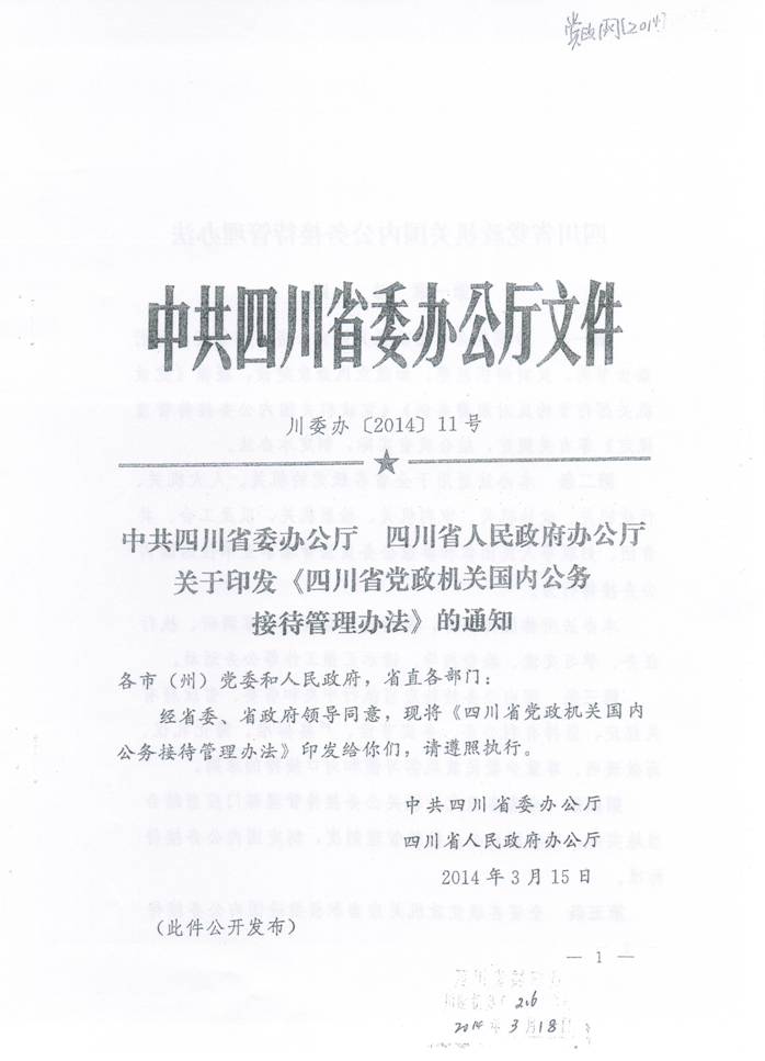 川委办〔2014〕11号-中共四川省委办公厅 四川省人民政府办公厅关于印发《四川省党政机关国内公务接待管理办法》的通知. 发布时间:2014-04-14 15:43:00 浏览次数: 次 【字体:小 大】 【打印正文】 上一条:关于实行校园临时交通管制的通告 下一条:计划财务处办理业务时间
