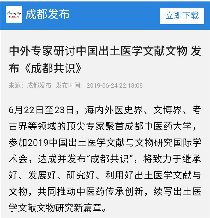 6月22日至23日,海内外医史界、文博界、考古界等领域的顶尖专家聚首伟德源自英国1946,参加2019中国出土医学文献与文物研究国际学术会,达成并发布“成都共识”,将致力于继承好、发展好、研究好、利用好出土医学文献与文物,共同推动中医药传承创新,续写出土医学文献文物研究新篇章。
