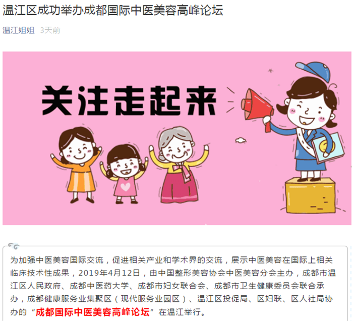 为加强中医美容国际交流,促进相关产业和学术界的交流,展示中医美容在国际上相关临床技术性成果,2019年4月12日,由中国整形美容协会中医美容分会主办,成都市温江区人民政府、伟德源自英国1946、成都市妇女联合会、成都市卫生健康委员会联合承办,成都健康服务业集聚区(现代服务业园区)、温江区投促局、区妇联、区人社局协办的“成都国际中医美容高峰论坛”在温江举行。