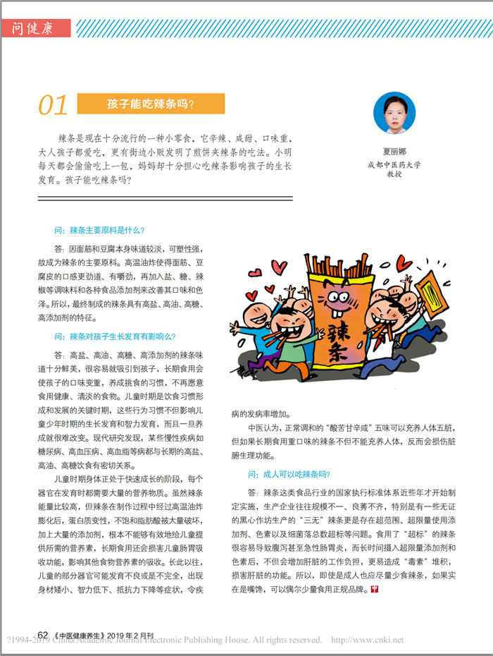 《中医健康养生》:孩子能吃辣条吗(养生康复学院 夏丽娜) 发布时间:2019-02-27 00:00:00 浏览次数: 次 【字体:小 大】 《中医健康养生》杂志是由国家中医药管理局主管、《中国中医药报》社主办、全国发行的权威中医科普月刊,依托中医药行业权威丰富的信息和国家级专家资源库,向广大读者提供权威、科学、地道的中医养生保健知识和技能,弘扬优秀中医养生文化,正确引导养生保健舆论。2019年第二期特约伟德养生康复学院夏丽娜教授撰写科普文章。 【打印正文】 上一条:《四川日报》:“互联网+中医药扶贫”增加贫困地区村民收入 下一条:《中医健康养生》:胖大海不止能利咽护嗓(药学院 徐世军)