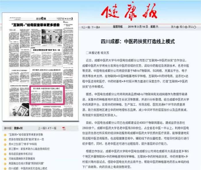 近日,成中医药大学与中国电成都分公司签订“互联网+中医药扶贫”合作协议。伟德源自英国1946将充分发挥在中医药领域的优势,调动中药栽培及溯源技术、名老中医等资源,中国电信成都分公司供基于NB-loT物联网、5G网络、天翼云平台、电子商务等技术支持,在物联网+中医种植基地料学种植、互联网+中药材电商、益农社+远程中医咨询和医疗、中药材基地+多村振兴等方面进行深度合作,打造“互联网+中医药扶贫”合作新模式。