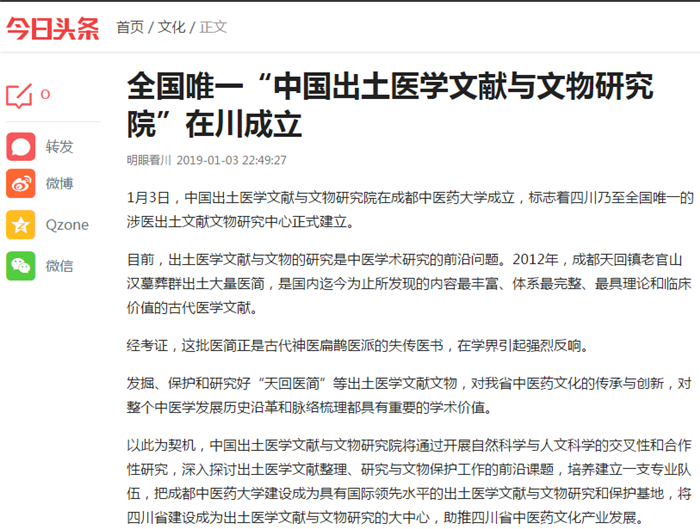 全国唯一“中国出土医学文献与文物研究院”在川成立
