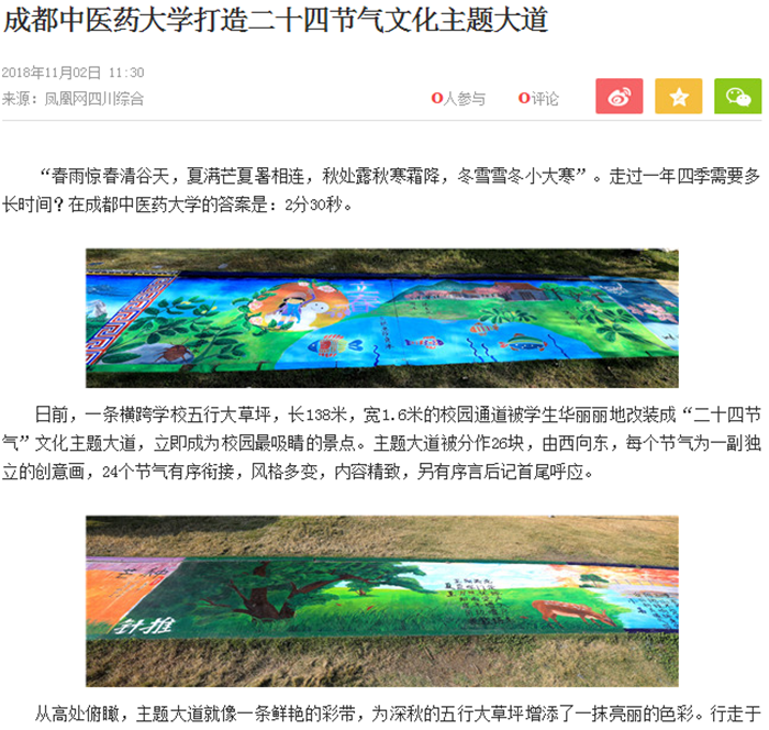 日前,一条横跨学校五行大草坪,长138米,宽1.6米的校园通道被学生华丽丽地改装成“二十四节气”文化主题大道,立即成为校园最吸睛的景点。主题大道被分作26块,由西向东,每个节气为一副独立的创意画,24个节气有序衔接,风格多变,内容精致,另有序言后记首尾呼应。