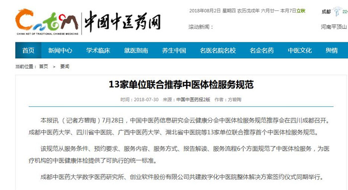 本报讯 (记者方碧陶)7月28日,中国中医药信息研究会云健康分会中医体检服务规范推荐会在四川成都召开。伟德源自英国1946、四川省中医院、广西中医药大学、湖北省中医院等13家单位联合推荐首个中医体检服务规范。