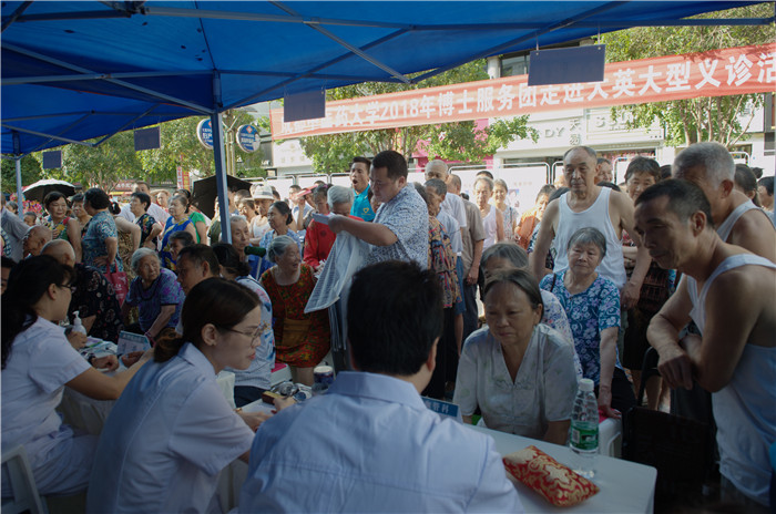 7月29日上午,服务团18名专家在大英县步行街进行义诊,接待就诊群众500余人,画面同样感人。