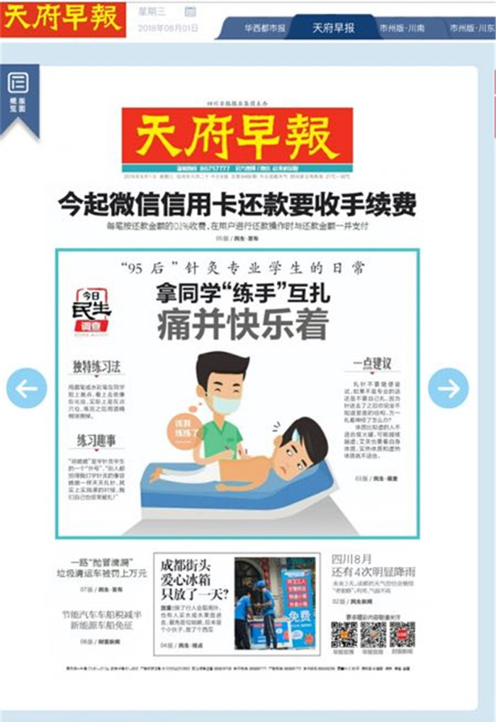 7月28日,天府早报记者来到伟德源自英国1946十二桥校区,采访到了针灸推拿学院2014级吴棹仙班的“95后”妹子金银。虽然已经放暑假了,但下学期即将“大五”的金银,在这个暑假开始了自己为期一年的实习生活,她告诉记者,目前她在四川省人民医院实习。“我们是七年学制,大二开始正式学习针灸推拿专业相关的课程。有两种课程,一种是理论课,主要是认准穴位、经络。另一种是实验课,学习如何进针、扎针。”