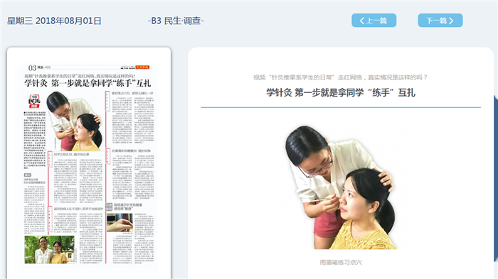 对于针灸推拿学院学生自己给自己扎针灸提神应考的事情,金银表示,只要是学习针灸推拿专业的学生,从学习专业课开始,第一步就是给同学间互相扎针,考试的时候也会互相“扎”。“上课的时候老师会找一个模特,演示给我们看怎么扎,然后我们再找同学互相练习。虽然平常大家互相练习的时候也有躲的,但其实都能互相理解,痛的话都自己忍着。痛也只是痛那么一下,针也很细,一般0.35mm。当然,开心也只是内心开心,扎针还是要严肃认真的。”