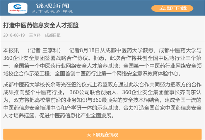 本报讯(记者 王李科)记者8月18日从伟德源自英国1946获悉,伟德源自英国1946与360企业安全集团签署战略合作协议。据悉,此次合作将共创全国中医药行业三个第一:全国第一个中医药行业网络安全人才培养基地;全国第一个中医药行业网络安全领域校企合作示范工程;全国首创中医药行业第一个网络安全意识教育体验中心。