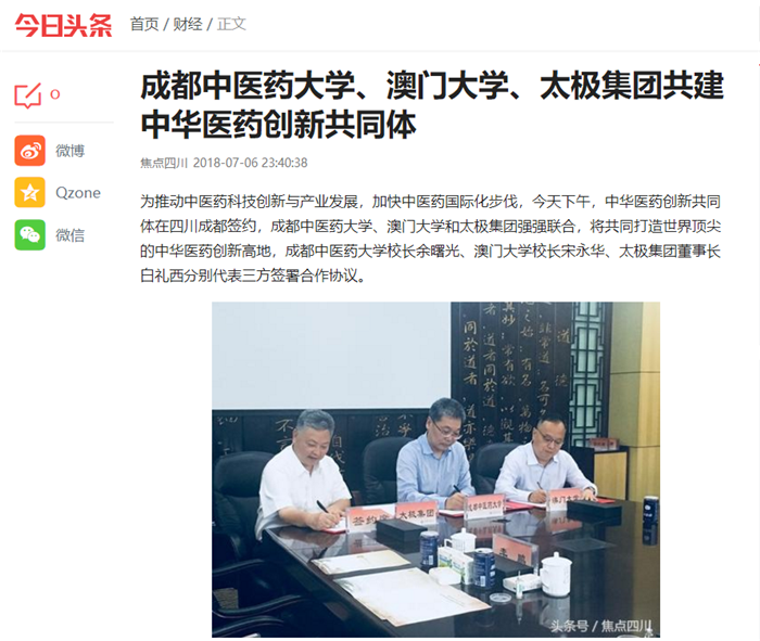 三方将利用境内外的优势和特色,有机整合与统筹三方在研究机构专业人才的资源,特别是澳门大学拥有我国唯一的中药质量研究国家重点实验室。合作共建内容包括伟德源自英国1946-太极创新研究院、澳门大学-太极中华医药创新研究院、重庆太极研究院。同时,太极集团将斥资10亿设立“中华医药创新基金”,支持创新共同体建设。