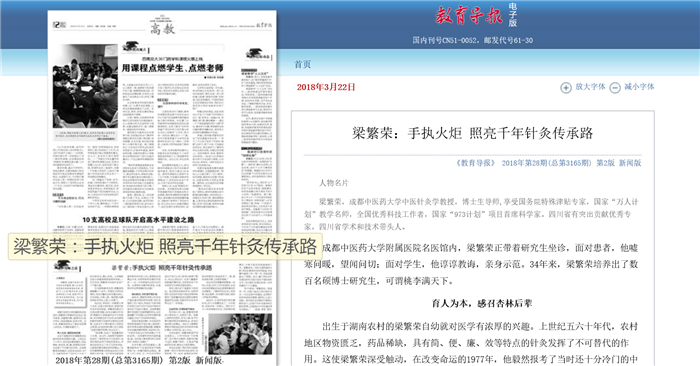 他总说,学校的一切都要以育人为本,这是大学的使命,更是中医针灸未来的希望。梁繁荣的感召力总是如影相随:由他主编的《针灸学》等教材已成每届学生手中的经典,多次再版也供不应求;由他录制的教学视频不但被学生争相点击观看,也成为不少青年教师上岗前的必修课;由他指导的博士论文荣获“全国百篇优秀博士毕业论文”。