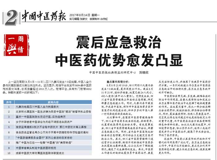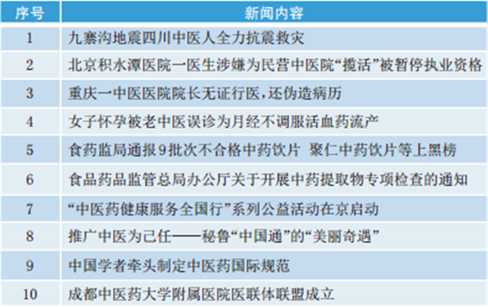 上一监测周期(8月5日~11日),四川九寨沟发生7.0级地震,中医人全力参与抗震救援成为舆论关注热点。监测显示,微信平台共发布9894条中医药相关图文消息,总阅读量超过2015万人次。微博平台,共有热门微博8852条。转载热度前十的新闻如图: