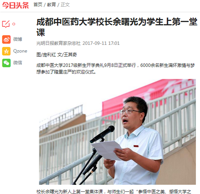 校长余曙光为新人上第一堂集体课,与师生们一起“参悟中医之美、感悟大学之道、领悟健康人生”。余曙光结合坐落在学校南大门的标志性雕塑,讲述了我国著名中医专家、时任针灸教研室主任吴棹仙先生向毛主席敬献“子午流注环周图”的故事,教育引导新生参悟中医之美,懂得中医的国学之美、智慧之美、仁爱之美;结合坐落在博物馆前的标志性雕塑,讲述学校首任校长、全国著名中医学家李斯炽先生矢志中医、不挠不屈,一生以发扬国粹,改进中医药为己任的故事,教育引导新同学感悟大学之道,懂得感悟大学德育之道、卓越之道、文化之道;结合坐落在逸夫楼前的第三个标志性雕塑,讲述全国中药学泰斗、中药学科奠基人凌一揆教授终身致力于中医药健康事业,为中药学的教材建设、专业学科建设、科学研究、高层次人才培养、中医药学术和产业化发展、全民健康事业作出卓越贡献的故事,教育引导新同学领悟健康人生,懂得领悟生活之理、治学之法、健康之道。余曙光希望同学们珍惜大学时光,保持至精至诚的价值追求,不断增强自身的责任感和使命意识,为中医药的传承和发展贡献力量。