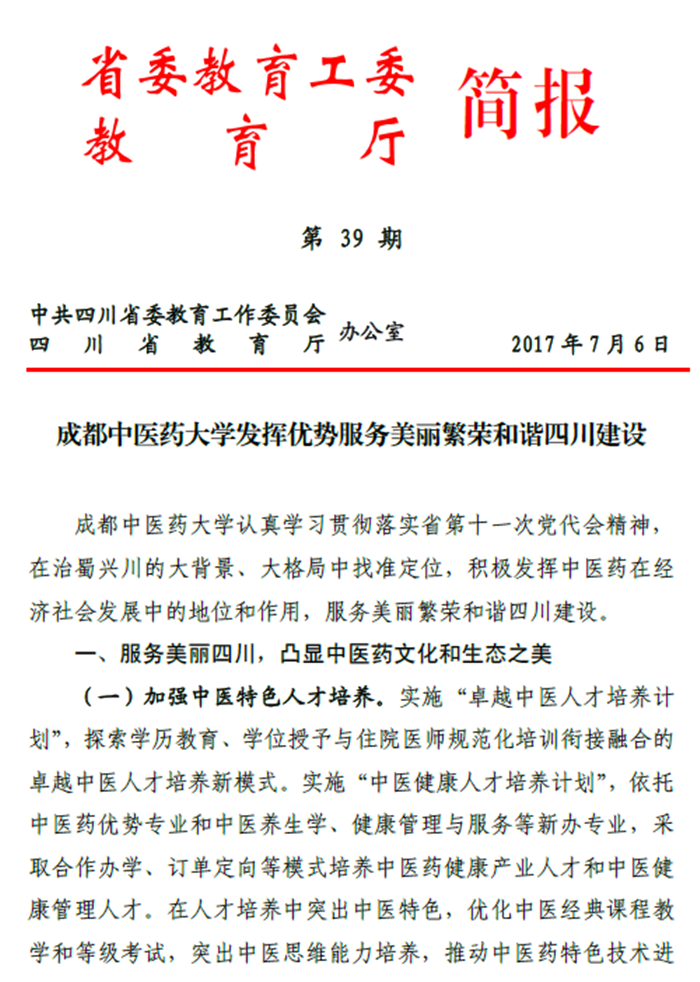 (三)搭建中医药文化发展研究平台。办好四川省高校人文社科重点研究基地——四川中医药文化协同发展研究中心,依托学校在中医药传统文化研究、教学方面的底蕴,借助现代时尚的媒介传播手段和设计理念,弘扬和发展中医药文化。