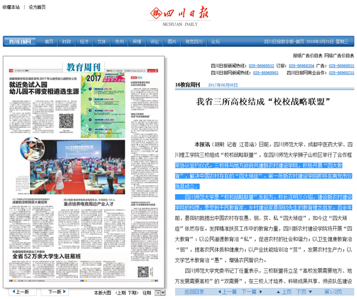 四川师范大学是“校校战略联盟”发起方。校长汪明义介绍,建设新农村建设学院的构想,是受到平民教育家、乡村建设家晏阳初先生的教育理念启发。百余年前,晏阳初就提出中国农村存在愚、弱、贫、私“四大顽症”,如今这“四大顽症”依然存在。发挥精准扶贫工作中的教育力量,四川新农村建设学院将开展“四大教育”:以公民道德教育治“私”,促进农村的社会和谐力;以卫生健康教育治“弱”,提高农民体质和健康力;以产业技能培训治“贫”,发展农村生产力;以文学艺术教育治“愚”,增强农民智识力。