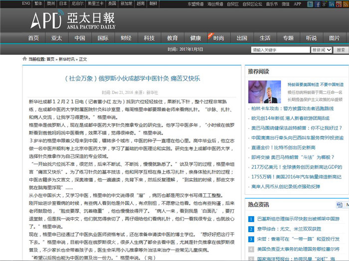 现在,格里申已经通过了中医执业医师资格考试,还在准备申请读中医的博士学位。“想好好把这行干下去。”格里申说,目前中医在俄罗斯很火,很多人生病了都会去看中医,尤其是针灸推拿在俄罗斯很普及,不少家长也会带着孩子去,医生会采用小儿推拿等外治法来治疗一些常见儿童疾病。