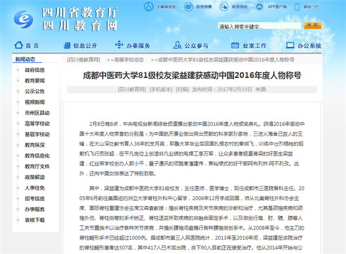 其中,梁益建为伟德源自英国194681级校友,主任医师,医学博士,现任成都市三医院骨科主任。2005年6月前往美国纽约洲立大学脊柱外科中心留学,2006年12月学成回国,师从北美脊柱外科协会主席、国际脊柱重建协会主席汉森袁教授;擅长脊柱疾病及关节疾病的诊断和治疗,尤其是颈椎疾病和颈椎外伤、脊柱侧弯的手术矫正、脊柱退变所致疾病的非融合固定手术,以及微创行肩、肘、髋、膝等人工关节置换术以治疗各种关节疾病,并擅长腰椎间盘镜行各种腰椎微创手术。从2008年至今,他主刀的脊柱畸形手术已经超过1000例。据成都市第三人民医院统计,2013年至2016年间,梁益建在该院治疗的脊柱畸形患者达507名,其中417人已术后出院,余下90人目前正在接受治疗。他从2014年开始与公益基金合作,据不完全统计,目前获得帮助的患者接近200位,金额近500万元。2015年2月,梁益建发表在国际脊柱顶级杂志《Spine》上的论文,以“无一问题提出”状态全文发表,打破了该杂志在审稿时针对每篇文章提约20个问题的惯例。