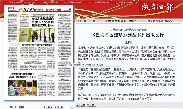 据了解,此书还成功申报为四川省社科课题,因而顺利完成了已故巴蜀现代名医存世资料的搜集、整理研究工作,并保证了这套丛书的高品质和高水平。