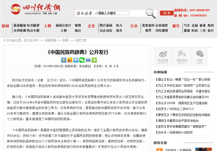 四川经济日报讯(记者 王万川)近日,《中国民族药辞典》公开发行的新闻发布会在成都举行,来自全国30余所高校、职业院校和科研院所的150余名各民族师生出席大会。