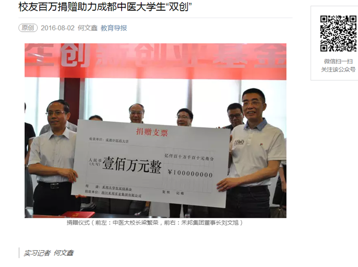 禾邦集团向中医大捐赠100万大学生“双创”基金,鼓励和资金支持该校学生进行中医药研发。刘文旭是成都中医大上世纪八十年代毕业的学生,对母校一直怀有特殊的情感,此次捐赠,既是为了推动中医大的教育发展,也是为了与学校深度合作,加快在校师生科研转化成果的速度。