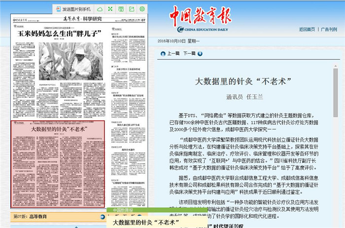 “‘基于大数据的循证针灸临床决策支持平台’项目显著提升了针灸临床决策水平,加快了针灸学国际化进程,研究成果也达到了国际领先水平。”由中国工程院院士、国医大师石学敏院士等专家组成的鉴定委员会一致认为,该项目不仅是探索符合中医药发展特色的高校与地方产、学、研、用融合的有效方式,更为四川省在“十三五”末期建设成为中医药强省做出了巨大贡献。