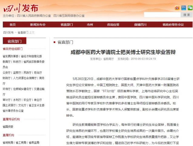 5月28日至29日,伟德源自英国1946举行国家级重点学科针灸推拿学2016届博士研究生学位论文答辩会,中国工程院院士、国医大师、天津中医药大学第一附属医院名誉院长石学敏院士,国家“973计划”项目首席科学家、上海市经络研究中心主任吴焕淦研究员应邀担任答辩委员会主席,贵阳中医学院、四川省中医科学研究院、四川省中医院的同行专家及学校针灸推拿学的多名博士生导师担任答辩委员会委员。校长、国家级重点学科针灸推拿学学术带头人梁繁荣教授,副校长余曙光研究员出席答辩会。