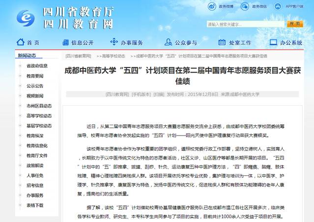 该校青年志愿者协会作为学校重要的团学组织,遵照校党委行政工作部署,坚持立德树人,实践育人,长期致力于以中医传统文化为特色的志愿者活动,社区义诊、山区医疗等都是长期开展的项目。“五四”计划中的“五”即推拿、拔罐、刮痧、针灸、运动康复五种中医护理方法,“四”即瘫痪、脑瘫、肢体残障、精神心理残障四类残疾人群。该项目开展依托学校专业优势,集护理与培训为一体,以中医学、护理学、针灸推拿学、康复医学为特色,发扬中医药传统文化,促进残疾人群和有肢体功能障碍的老年人康复,提高他们的生活质量。
