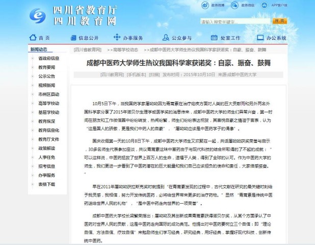 这样的巨大成就对中医药大学的师生是极大的鼓舞,师生们认为,本次获奖开启了中医药文明走进诺贝尔科学奖大门之旅,千百年来的实践证明中医药在服务人类健康和治疗重大疾病方面有明显优势,将来在很多领域必然可以展现更大的成绩和贡献。中医人振兴中医,推动中医药走向世界任重道远。同时师生们还表达了应学习屠呦呦的朴实低调的人格魅力和奉献创新的科研精神,认准目标,潜心科研,“耐得住寂寞”,经得起考验正是荣誉背后的真实写照,40年前就已经取得的研究成果和广泛运用并对人类战胜疟疾作出巨大贡献,今天终于获得这份殊荣。要学习屠呦呦贵在坚持的品格,在“枯燥”科研道路上做好每一项平凡工作,不计名利,热心奉献。要学习屠呦呦及其团队们百折不挠,艰苦创业的攻关精神。师生们认为,今天国家对中医药的支持力度和学校浓厚的科研氛围,都是促进一系列成果形成的有利条件,应当以高度责任感和奉献敬业精神,努力为中医药科研事业做出更大贡献。