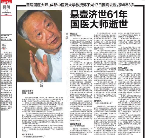 “上一次去看他的时候是在劳动节前,那时他的状态还不错,没想到……”郭老家中,学生刘渊不停叹气。说起这位老师,刘渊几度眼圈泛红。刘渊是郭老1994年至1997年的研究生,与郭老相识21年。去年11月,郭老病情加重,在四川大学华西医院治疗。这段时间,刘渊等学生还不间断地去看望老师。“有时他的精神状态不错,不过话说得不多,主要还是我们跟他说话。”刘渊等学生与郭老聊天的内容,主要是汇报工作,比如国医大师工作室等具体事宜。