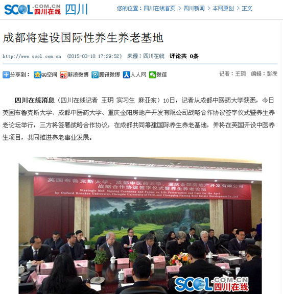 在备忘录签字仪式上,马跃荣介绍:“今后三方将围绕人才培养、共同研究,特别是将英国在养老方面取得的研究成果,在三方的共同支持下,于成都建立具有示范性的养生养老基地。并且通过中英两边积极推进在养生养老方面的学术交流,进一步为中国,乃至全世界即将全面进入老年社会而努力,做到老有所为、老有所养、老有所乐的健康养老模式服务世界。”