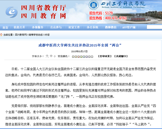 身处成中医校园的师生也时刻关注着两会的进程,从李克强总理的政府工作报告到政协委员和人大代表的提案,老师们和同学们通过不同的形式关注着两会,校园里到处充满着对两会探讨和思考的氛围,两会的各种热点话题也成了成中医师生课前课后要摆的“龙门阵”,一股两会风正在校园里吹拂。