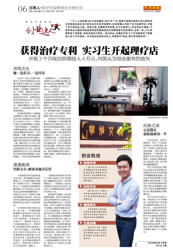2014年5月,何凯回老家眉山的医院实习。在实习之余,何凯开始尝试自己开理疗店。
