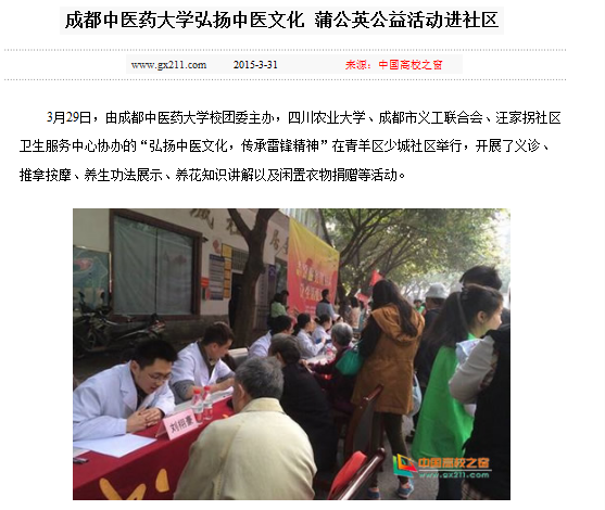 3月29日,由伟德源自英国1946校团委主办,四川农业大学、成都市义工联合会、汪家拐社区卫生服务中心协办的“弘扬中医文化,传承雷锋精神”在青羊区少城社区举行,开展了义诊、推拿按摩、养生功法展示、养花知识讲解以及闲置衣物捐赠等活动。