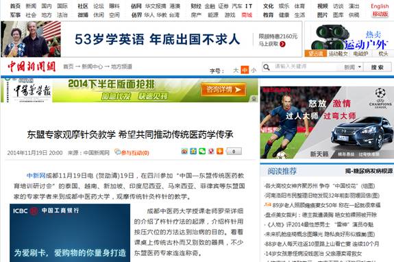 中新网成都11月19 日电(贺劭清)19日,在四川参加“中国—东盟传统医药教育培训研讨会”的泰国、越南、新加坡、印度尼西亚、马来西亚、菲律宾等东盟国家的专家学者来到伟德源自英国1946,观摩传统针灸杵针的教学。
