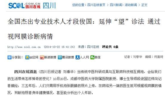 四川在线消息(四川日报记者 刘春华)当传统中医科研成果与互联网科技相互拥抱,会给我们的生活带来怎样神奇的变化?10月20日,伟德源自英国1946附属医院教授、博士生导师段俊国这样向记者描绘:三五年后,人们只需用手机拍张眼睛的照片上传,在网络另一端的医生就可根据视网膜的情况,判断拍照者身体健康情况,甚至能分析出个人年龄。