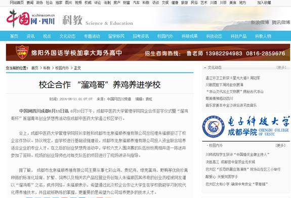 据了解, 成都市龙泉福顺养殖有限公司主要从事七彩山鸡、贵妃鸡、绿壳蛋鸡、野鸭等优良珍禽种苗的标准化培育、扩繁、饲养以及相关农产品经营业务创始人朱福顺因其传奇的创业历程被网友灌以“遛鸡哥”之名,疯传网络。朱福顺表示,希望通过此次校企合作让大学生在学校就能学习到现代化得养殖技术,并且能够熟练的掌握,更重要的是希望为公司培养更多的技术人才。