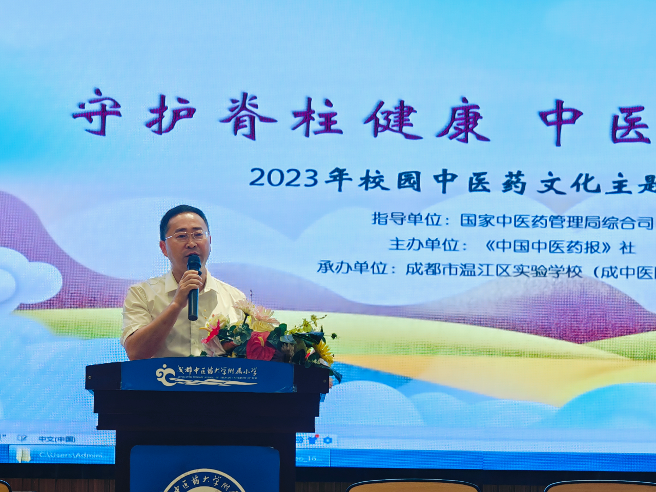 活动伊始,成都市温江区实验学校党总支书记、校长文家富精彩致辞。文校长重点介绍了实验学校在培养卓雅学子传承和发扬中医药文化的课程构建和活动开展方面所做的努力及取得的成效。他表示中医药文化进校园是弘扬中国传统中医药文化的最佳方式之一,它能激发孩子对于中国优秀传统文化的兴趣,促进了解和认同,增强文化自信、民族自信。希望孩子们从小了解中医、感受中医、认同中医,把老祖宗留给我们的中医药宝库保护好、传承好、发展好。