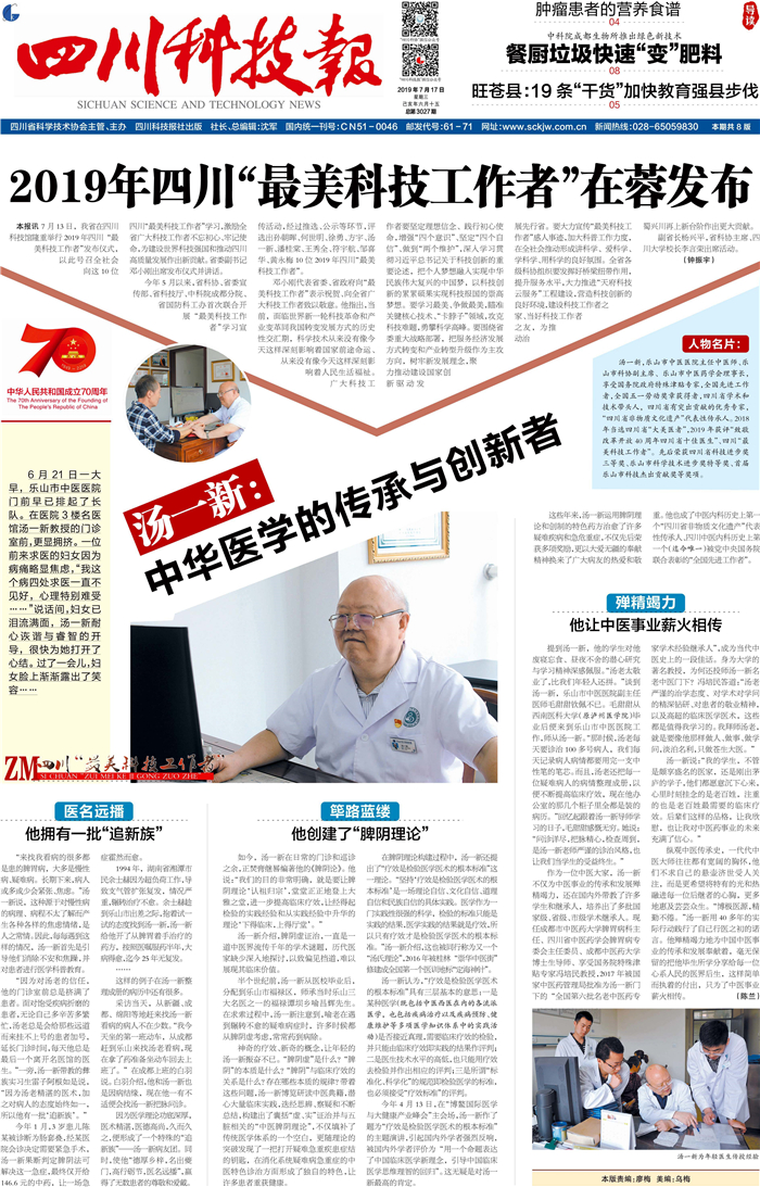 这些年来,汤一新运用脾阴理论和创制的特色药方治愈了许多疑难疾病和急危重症,不仅先后荣获多项奖励,更以大爱无疆的奉献精神换来了广大病友的热爱和敬重。他也成了中医内科历史上第一个“四川省非物质文化遗产”代表性传承人、四川中医内科历史上第一个(迄今唯一)被党中央国务院联合表彰的“全国先进工作者”。
