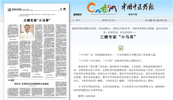 他有很多“高分量”的头衔:重庆医科大学教授、主任医师,国务院特殊津贴专家,全国科普先进工作者,全国优秀中医健康信使,重庆市优秀科技工作者;历任中华中医药学会常务理事、科普分会主任委员、重庆市中医药学会会长、重庆市科学技术协会常委、重庆市政协委员。现任中华中医药学会科普分会顾问、重庆市中医药学会名誉会长、《世界中医药》编委、《中医杂志》编委、《实用中医药杂志》顾问。