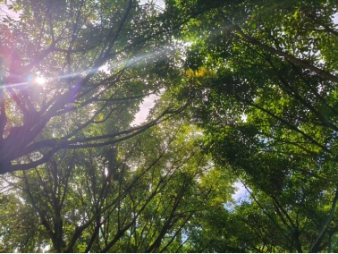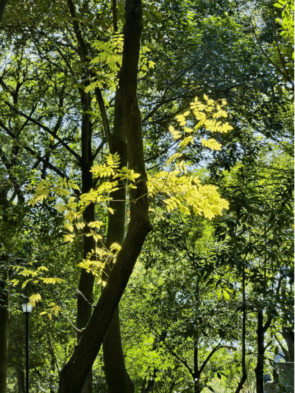 照片解说:晴日里,林间的浓绿裹着一角透亮的黄,正被阳光镀得暖润鲜活。枝桠斜斜探出,嫩黄的叶瓣叠着细碎的光,风过时簌簌轻颤,把光斑摇成树身上流动的金纹。深绿的背景里,这簇明黄像被时光慢放的暖意,连空气都浸着初秋的清宁,连远处路灯的轮廓,都成了这静谧里浅淡的注脚。