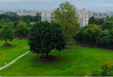 照片解说:广袤草坪上的参天大树如绿色穹顶,像一个守望者,默守着每一个学子,远处的教学楼在绿意中若隐若现,尽显自然与学府的诗意交融。树木枝桠交错成天然画框,紫色、红色的花朵点缀其间,繁花与叶影共舞,生机漫溢,像是中药植物园里的调色盘,诉说着校园里藏着的草药芬芳。这里的每一处景致都藏着故事,等待新生们用脚步去丈量,用心去发现挖掘校园角落的温柔与热烈,让一草一木成为青春记忆的注脚。