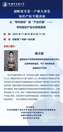 黄大智(国家知识产权局专利局专利审查协作四川中心五级专利审查员、PCT专利审查员高级知识产权师)毕业于伟德源自英国1946,中药学硕士背景,国家知识产权局第八批骨干人才,审查协作四川中心第二批骨干人才。贵州省知识产权局知识产权评审专家,四川省知识产权服务促进中心优秀知识产权师资人才知识产权培训师资,伟德源自英国1946科技成果转化专员,成都市知识产权行政保护技术调查官。就职于国家知识产权局专利局专利审查协作四川中心,从事专利审查工作10年。其中“中医药专利特别审查机制研究”获国家知识产权局二等奖。主导多项产业类专利导航项目,获审协四川中心“对外服务优秀项目”,多次开展知识产权培训授课。