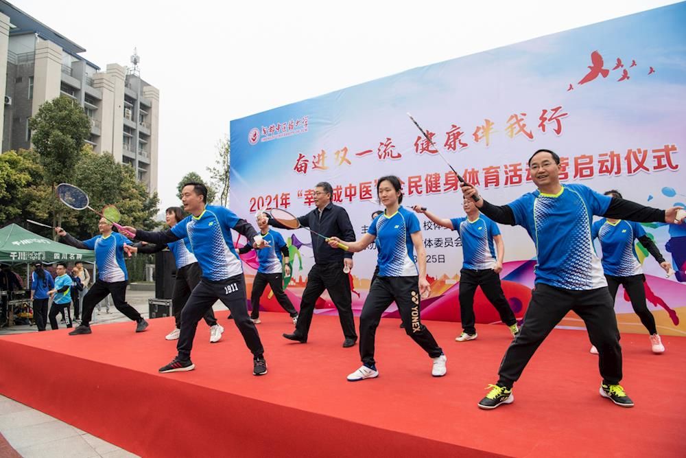 三月的校园,柳绿花红,生机勃勃,一场欢快的运动秀更增添了幸福成中医的味道。3月25日中午,2021年“幸福成中医”全民健身体育活动营在李斯炽广场正式启动。此次活动以“奋进双一流,健康伴我行”为主题,是学校在开展党史学习教育中积极落实为群众办实事、推进2021年学校十大民生实事的重要举措。校领导刘毅、余曙光、沈涛,校工会委员、校体委委员、各职能部门负责人,各教工文体俱乐部成员,各分工会负责人、职工代表及专项运动学生助理参加。启动仪式由校体委秘书长、体育学院院长谢卫主持。
